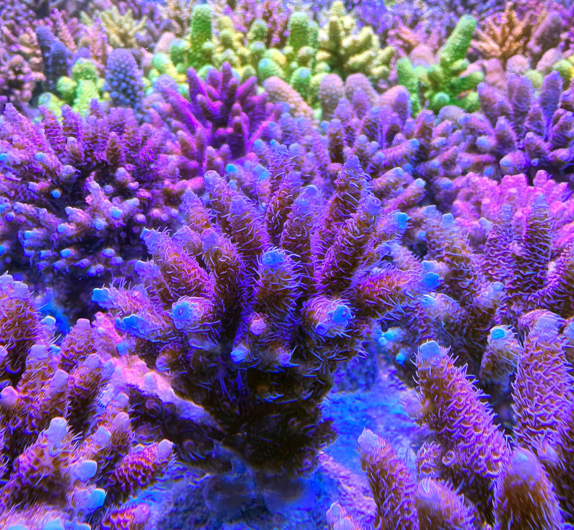 Inzwischen mussten wieder einige Korallen gekürzt werden oder ganz entnommen, um Platz für das enorme Wachstum zu schaffen. Größte Umstrukturierung: der über 60 cm große Acropora Hyacynthus Tisch war rechts an der Scheibe angekommen, so bekam er einen neuen Platz vorn.